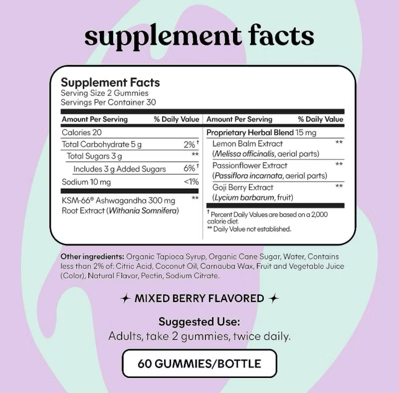 Las gomitas antiestrés Lemme Chill están formuladas con una dosis clínicamente estudiada de ashwagandha KSM-66®, que ha demostrado reducir el estrés ocasional, favorecer los niveles saludables de cortisol y reducir los antojos de comida relacionados con el estrés. Nuestra ashwagandha, altamente investigada, ha sido evaluada en 24 ensayos clínicos de "estándar de oro". Una mezcla de ingredientes botánicos, que incluyen pasiflora, melisa y bayas de goji, ayudan a mantener el estado de relajación. Lemme Chill fue formulado para uso diario, con mejores resultados después de 60 días de uso.