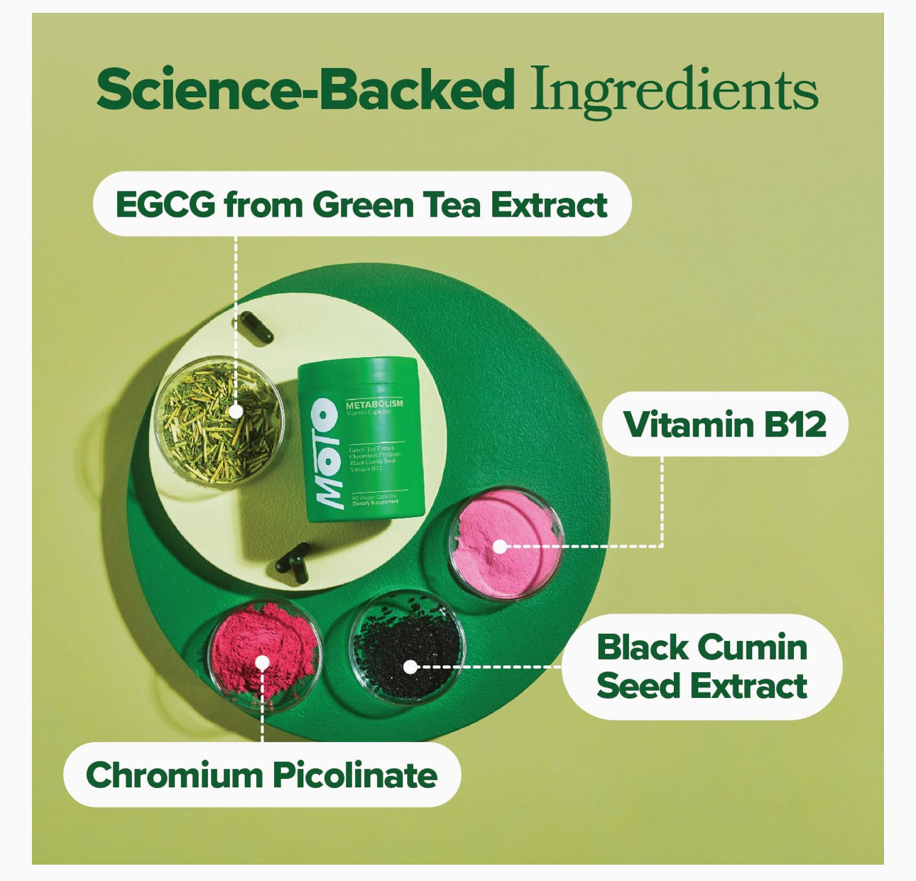 Ingredientes respaldados por la ciencia: MOTO está formulado con EGCG de extracto de té verde, picolinato de cromo, extracto de semilla de comino negro y vitamina B12.